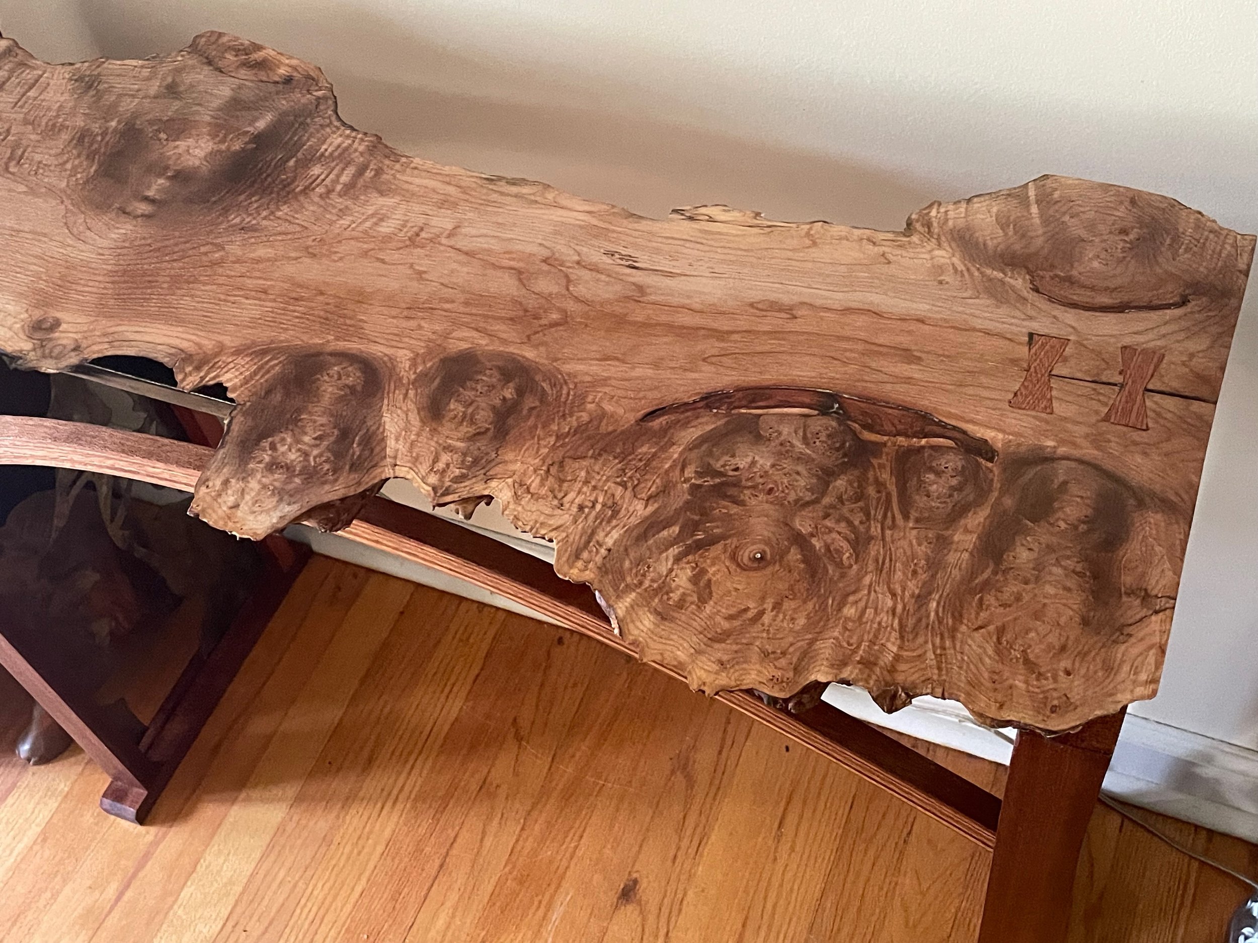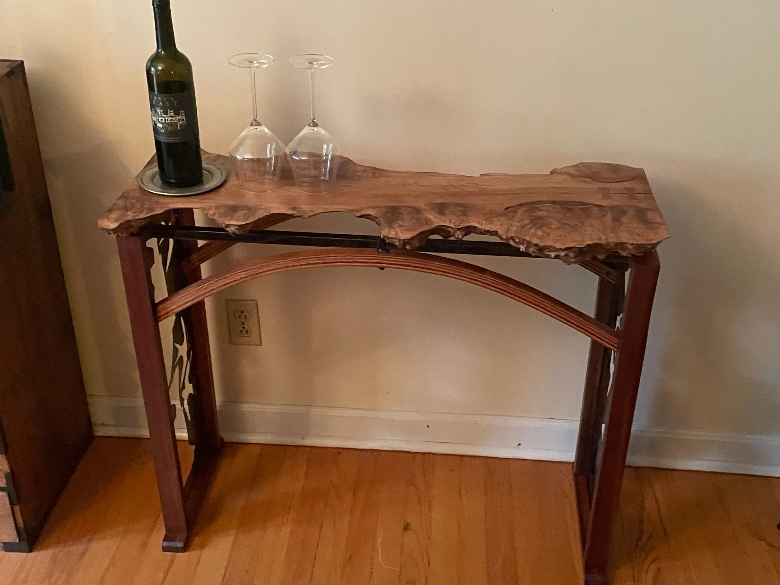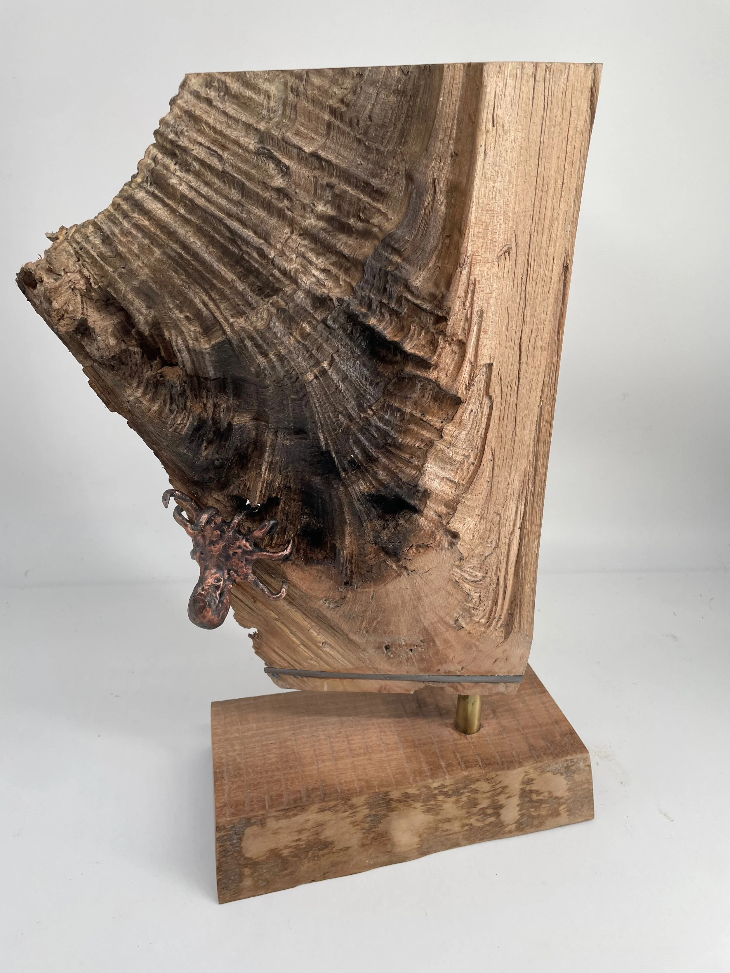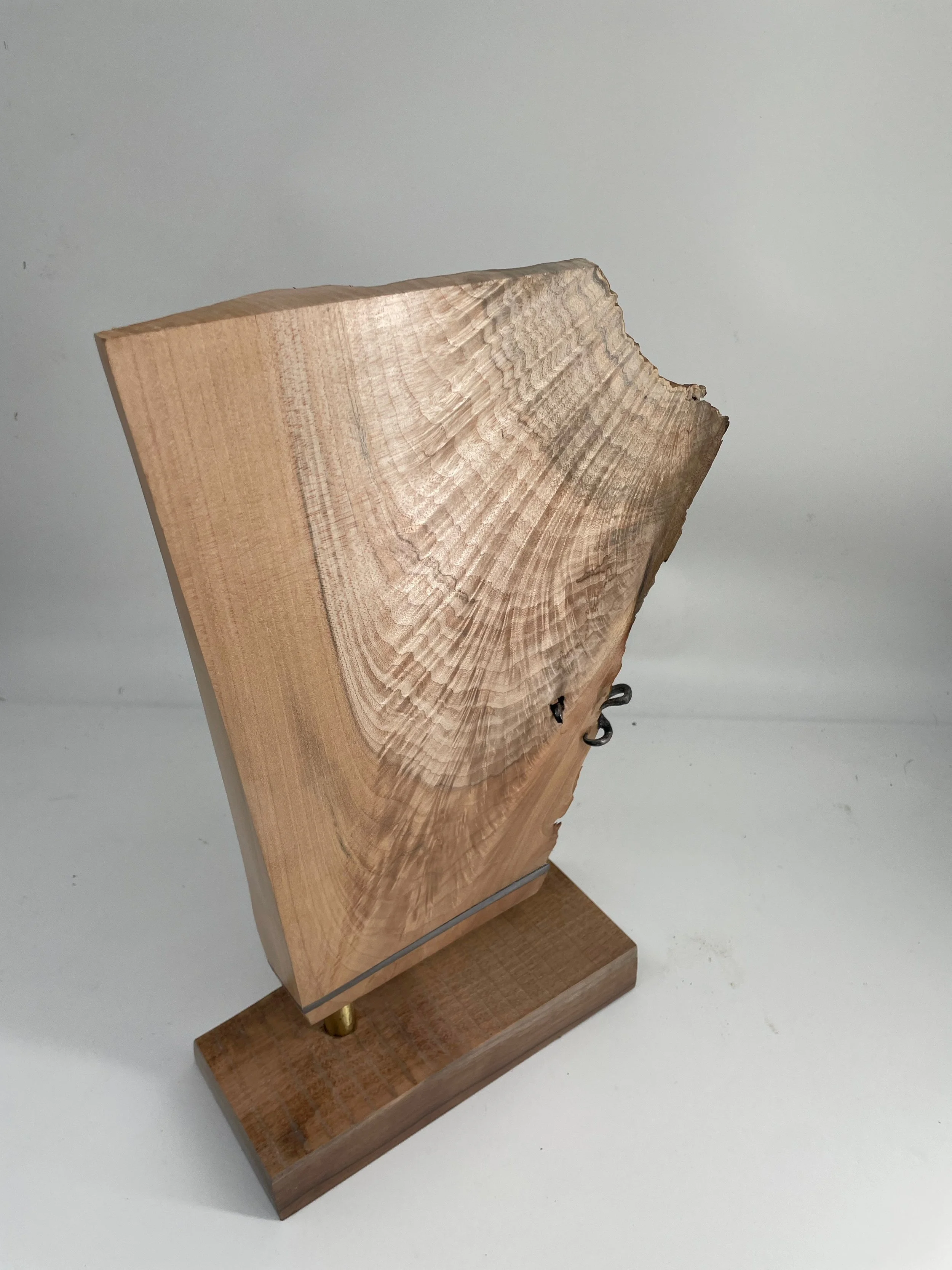 This sculptural work by Phil Seder is a marriage of the beauty of fine wood grain with small-scale forged and welded metal craft. The base material is a rescued piece of maple stove wood, milled to expose the extraordinary grain structure on one side and presented live-edged on the other. The octopus was created using intensely small sale forging and welding. Each arm of the completed octopus had to be heated and maticulously bent over many hours to carefully fit it around the wood. A final florish was added in the form of the steel band that runs the width of the piece and provides supporting structure of the single pole mounting point.